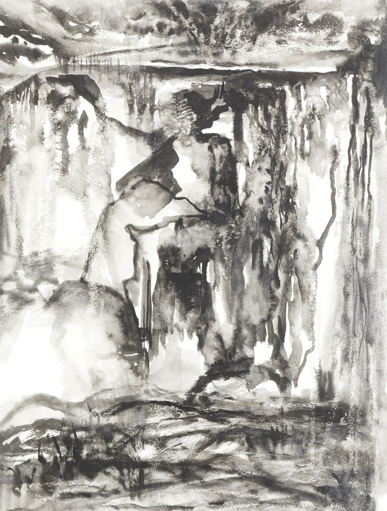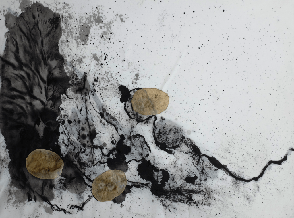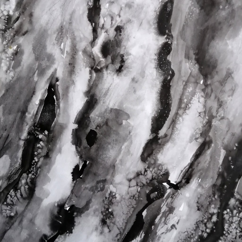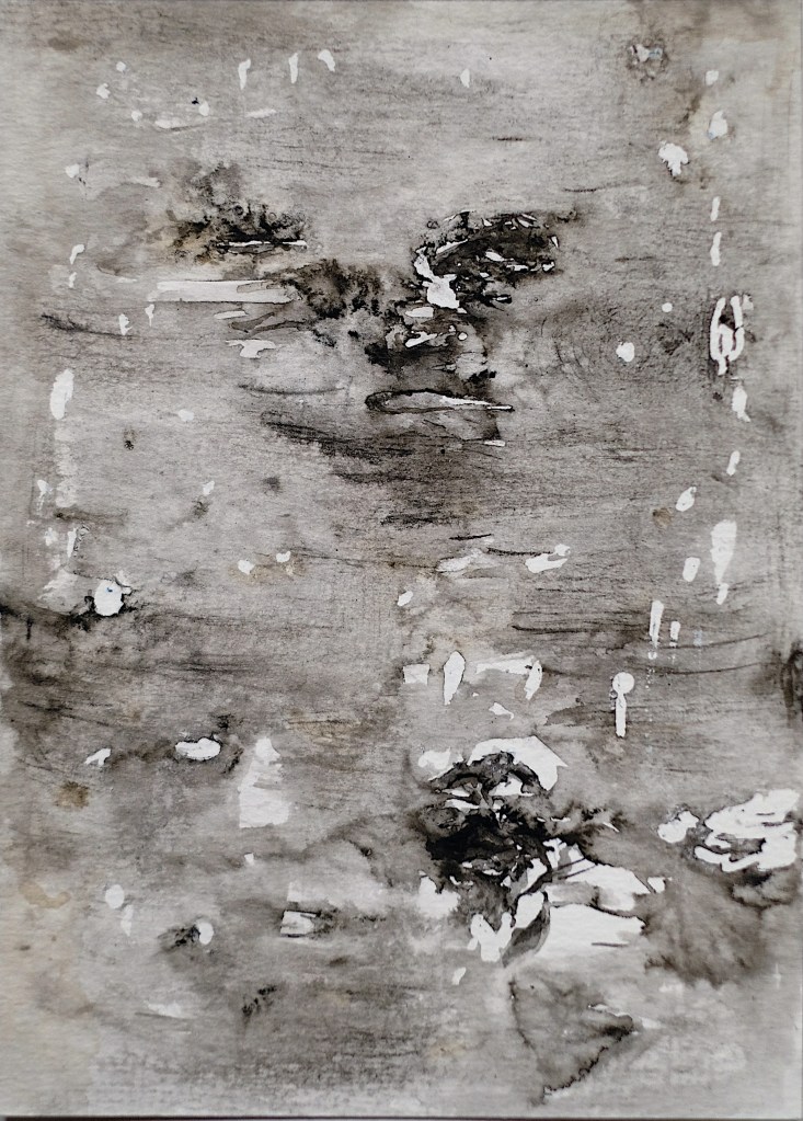 Le noir domine largement dans ces œuvres, créant une atmosphère mystérieuse et introspective. Mais au milieu de cette obscurité, des fissures de blanc apparaissent, laissant filtrer la lumière, s’envoler les cendres, et finalement l’espoir d’une renaissance..
